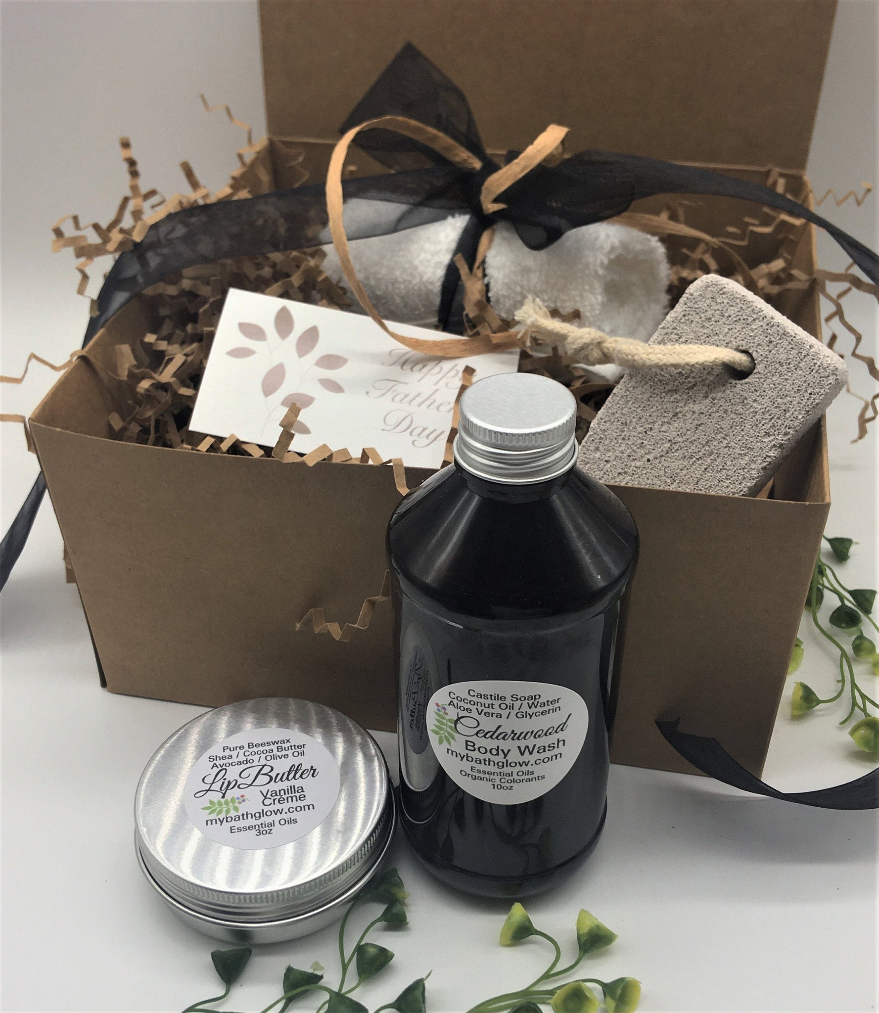 ■ This shower collection has all the essentials in a box set to make the perfect gift! Body Wash, Loofah Soap, Glycerin Soap, Massage Soap, Lip Butter & Accessories! Included accessories .. Pumice Stone, Tree Slice Soap Dish. A 100% cotton, absorbent washcloth with black ribbon and twine is provided to complete the masculine spa experience! If you've been looking for an essentials masculine spa set to give as a gift for someone special .. this shower basket is it!