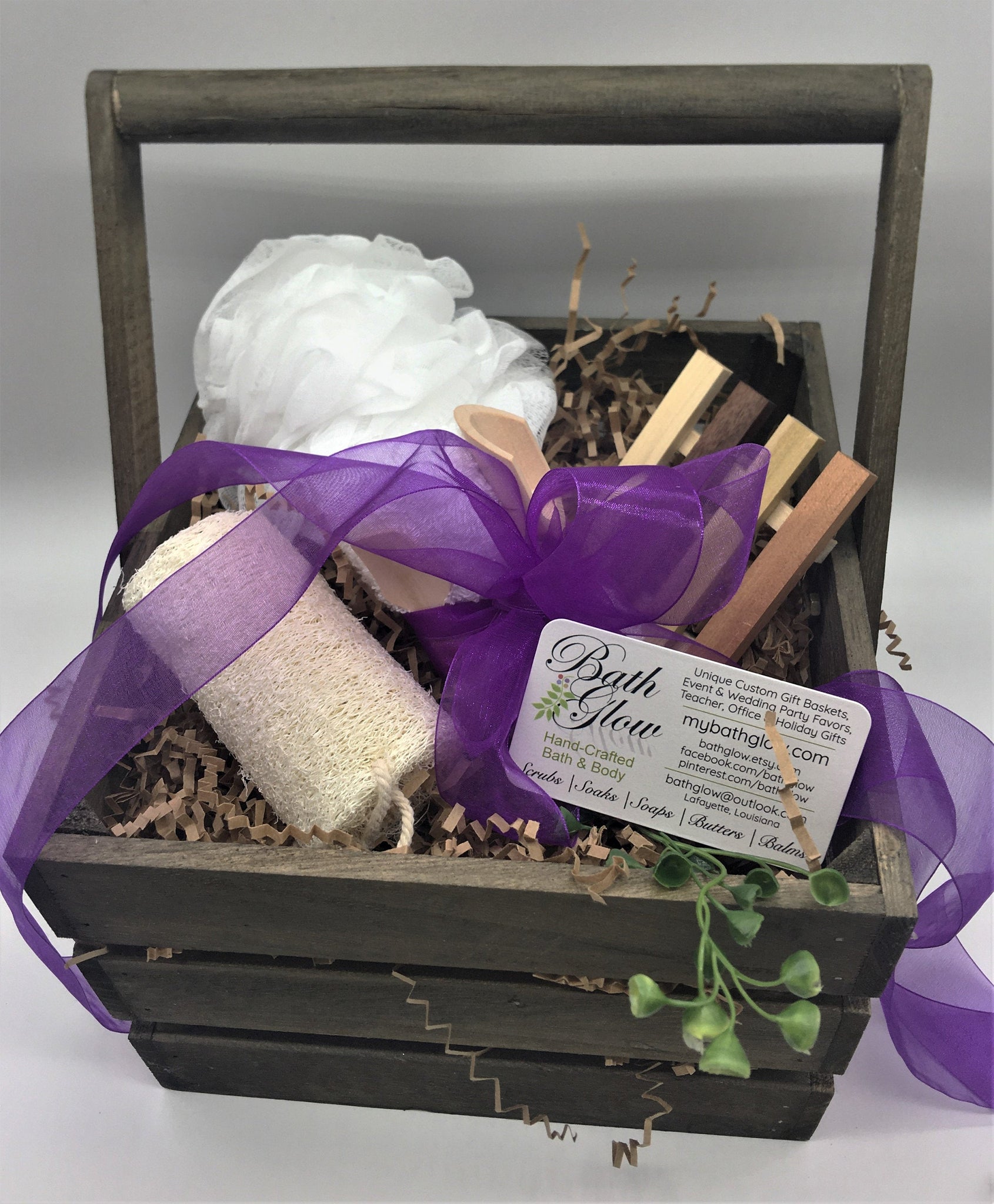 ■ This bath collection has absolutely everything and arrives in a beautiful, large wood crate to make the perfect gift for your spa lover! This crate is 9" x 9" with its height of 7" excluding handle / 12" including handle. It will look stunning on a bath counter while all the spa products are being used. This set has it all .. Bath Wash, Bath Soak, Sugar Scrub, Body Butter, Body Oil, Lip Butter, Lip Balm, Bath Bomb, Five Specialty Soaps & Accessories! Everything needed to exfoliate, moisturize, soak, smooth, and nourish your body and mind. Just the variety of containers alone make this set so amazing! Included accessories .. Pumice Stone, Loofah Scrubber, Reclaimed Wood Soap Dish, Loofah Pouf. A 100% cotton, absorbent washcloth tied with a beautiful matching organza ribbon is provided to complete the spa experience! If you've been looking for a complete spa set to give as an impressive gift for someone special .. this collection is it!