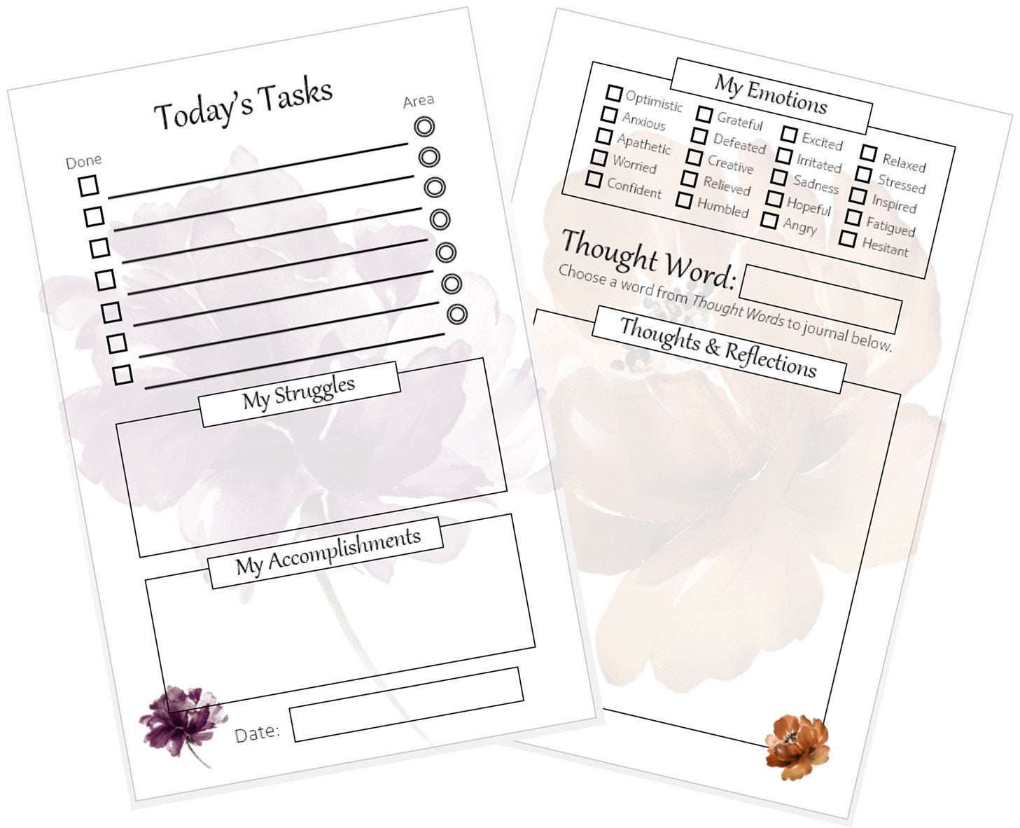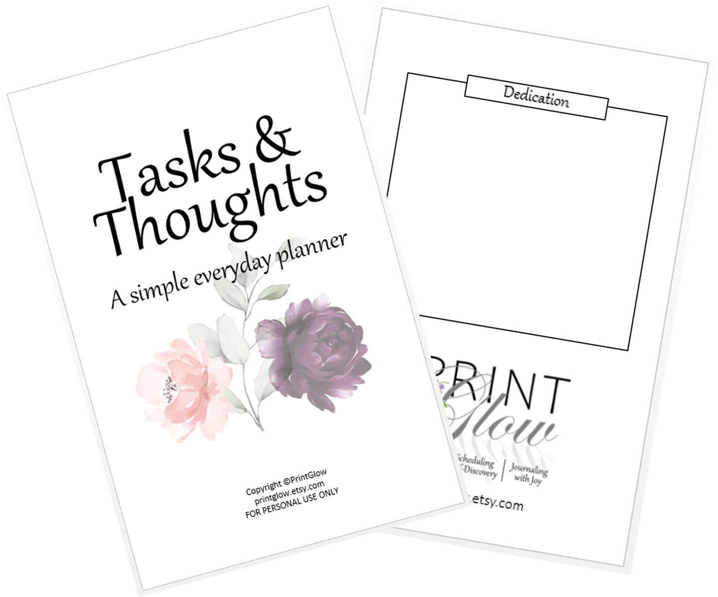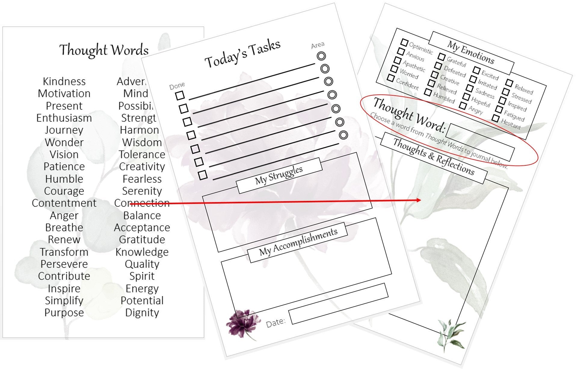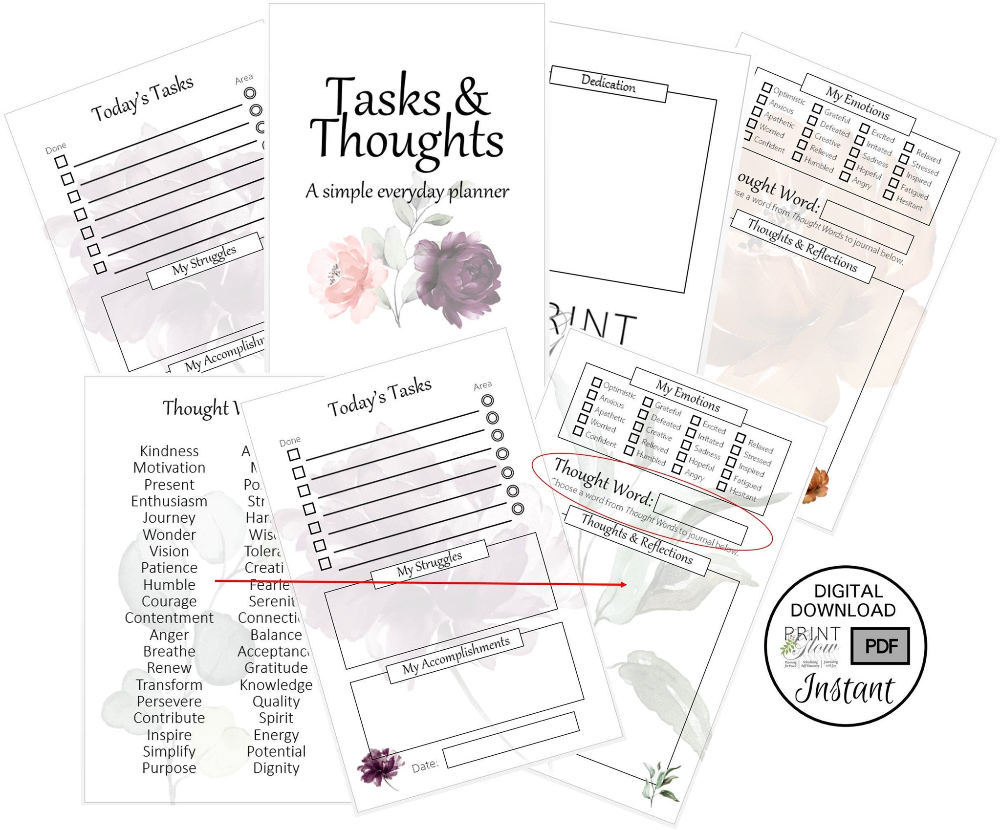 ■ Our Tasks & Thoughts Planner is a simple way to keep track of daily activities while enjoying the benefits of reflective journaling. Each day you select a Thought Word from the included list and reflect on that word for the day’s journaling. These writings help us think about our lives and often help us discover solutions to everyday problems. Our printable planners, journals, invitations and unique keepsake gifts are simple to complete and understand … less time to write, more time to wonder … less reading, more reflection .. less labeling, more living .. less hard-core planning and more peaceful journaling.