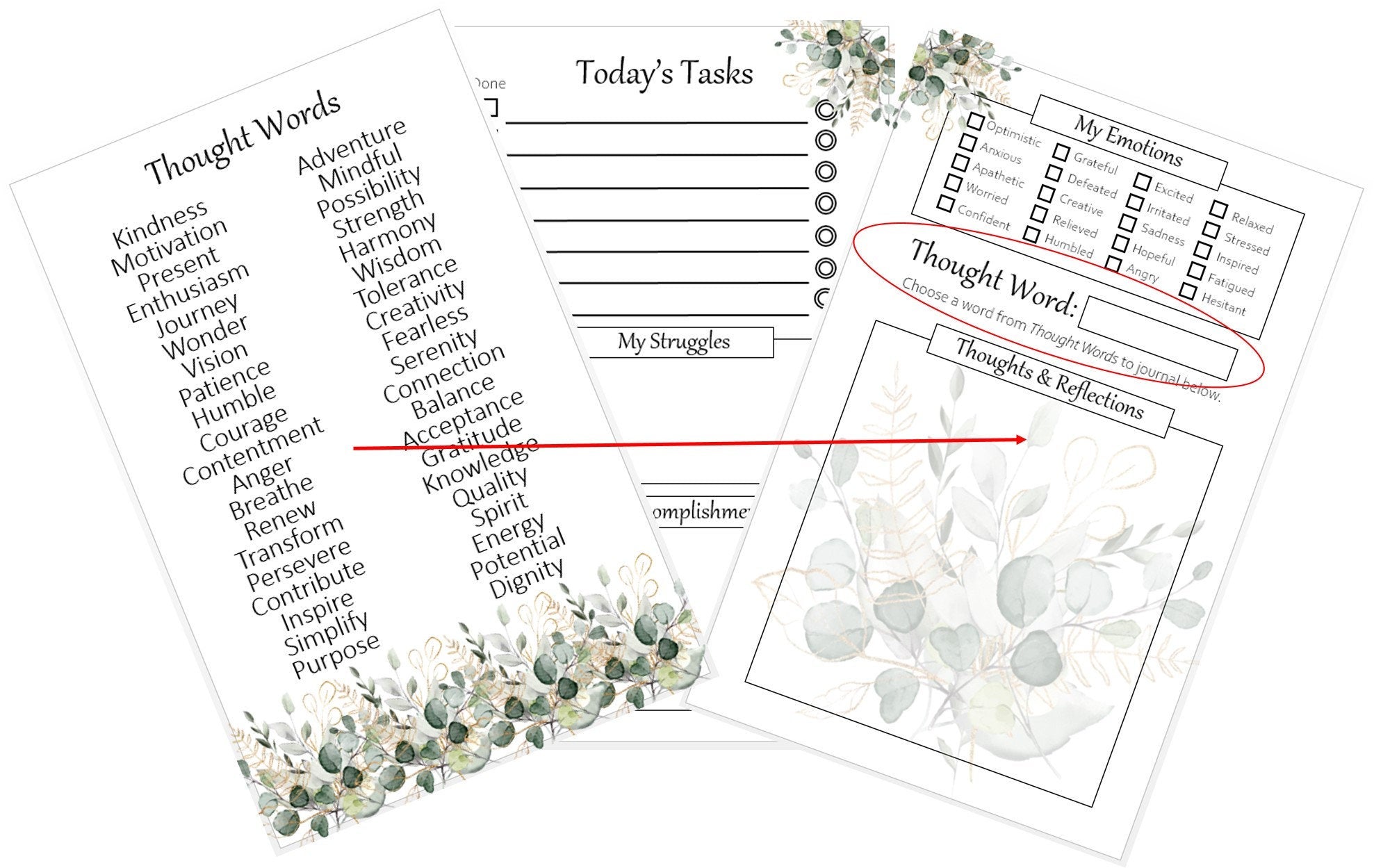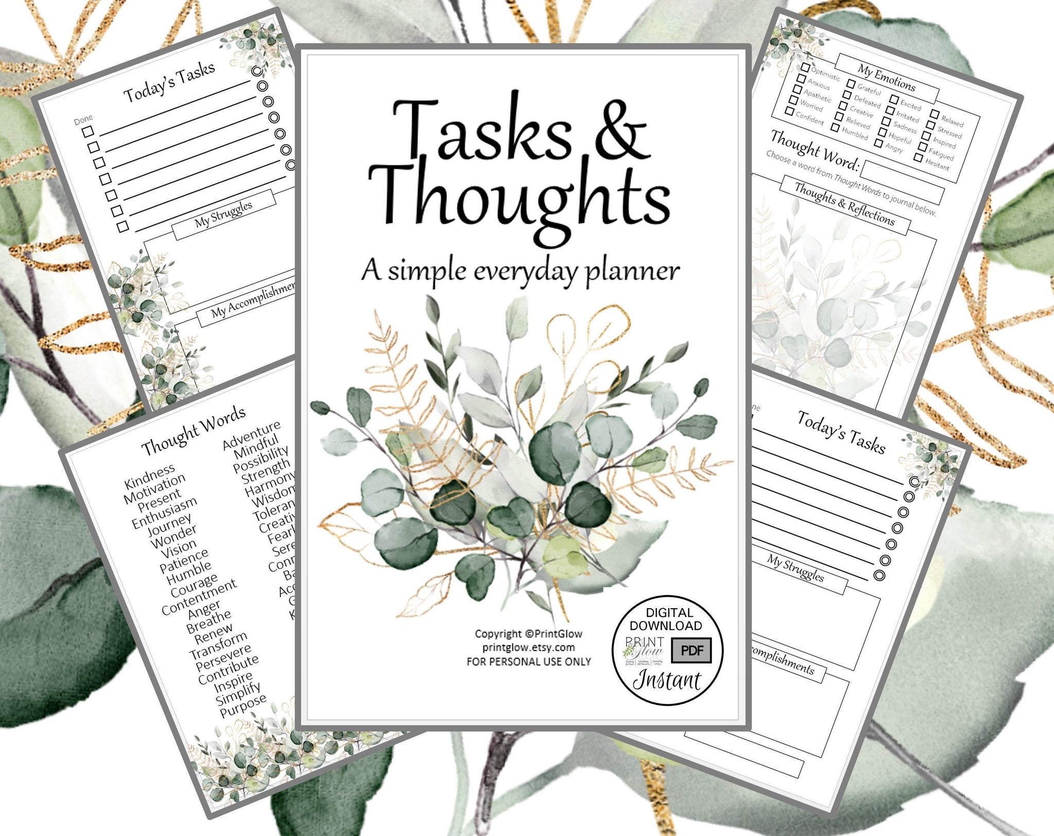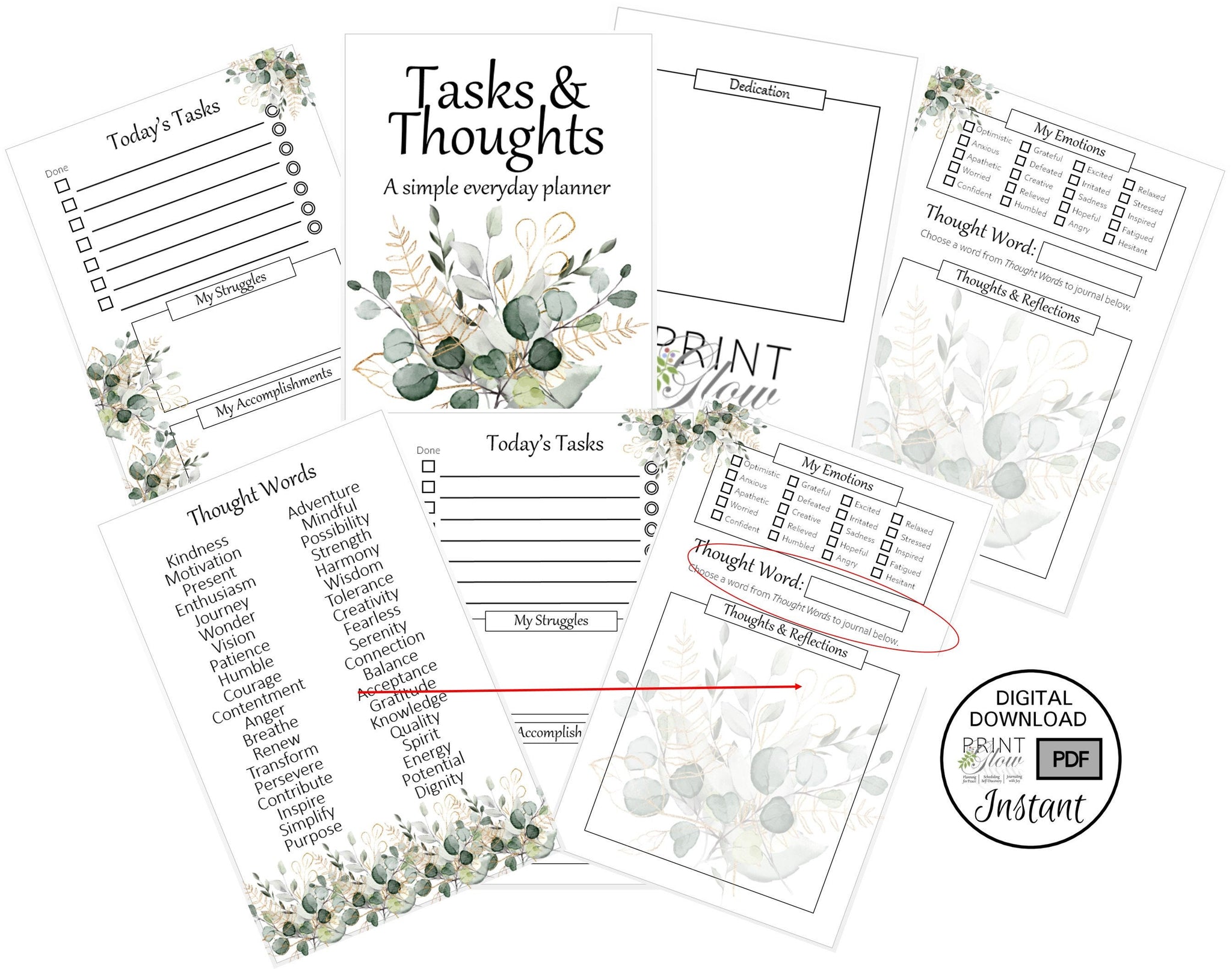 ■ Our Tasks & Thoughts Planner is a simple way to keep track of daily activities while enjoying the benefits of reflective journaling. Each day you select a Thought Word from the included list and reflect on that word for the day’s journaling. These writings help us think about our lives and often help us discover solutions to everyday problems. Our printable planners, journals, invitations and unique keepsake gifts are simple to complete and understand … less time to write, more time to wonder … less reading, more reflection .. less labeling, more living .. less hard-core planning and more peaceful journaling.