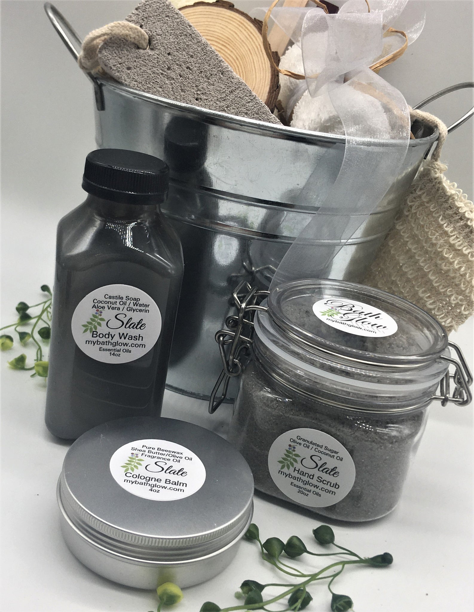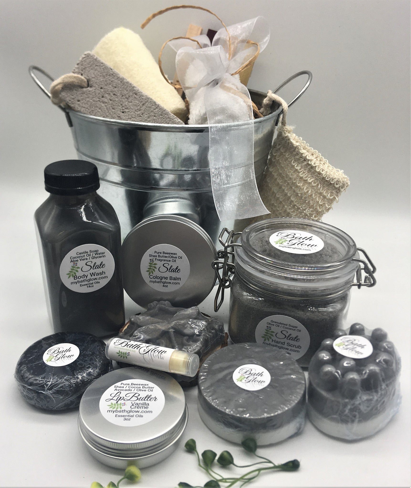 ■ The industrial look and feel of a large metal bucket filled with handmade shower products and accessories make it a perfect men's gift for all occasions. Our Slate scent mixes Bergamot, Warm Spice, Cedarwood & Musk for a fresh masculine scent. A great gift for the man in your life!