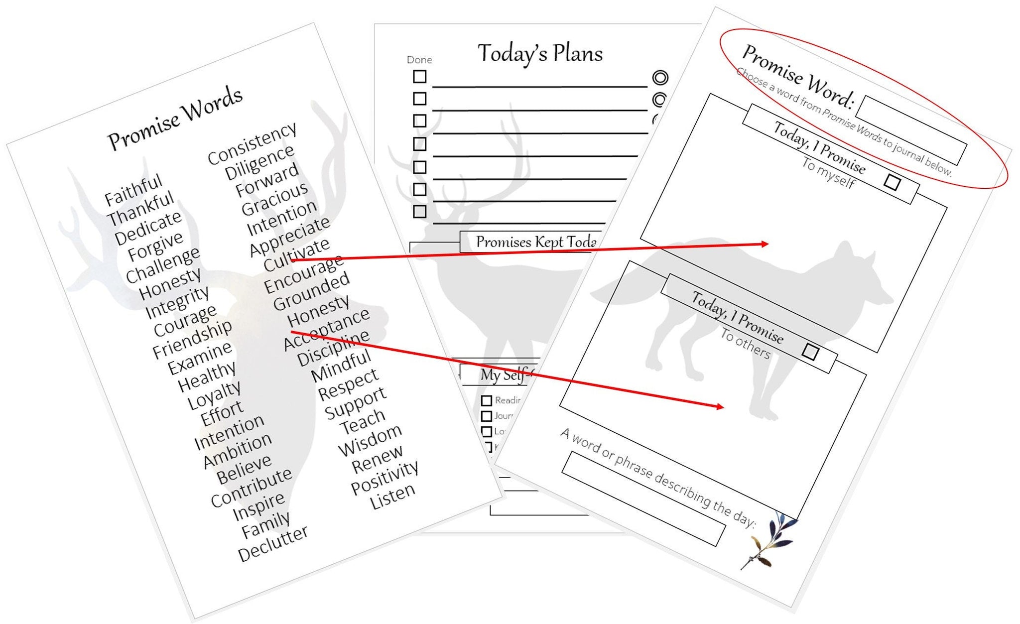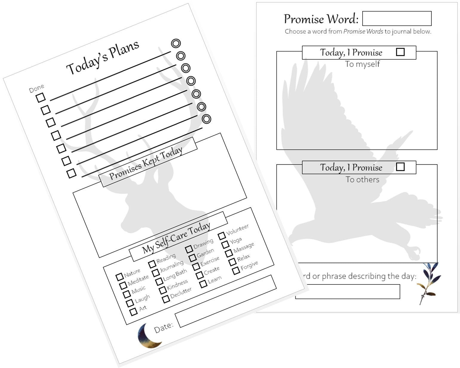 ■ Our Plans & Promises Planner is a simple way to keep track of daily activities while enjoying the benefits of reflective journaling. Each day you select a Promise Word from the included list and reflect on that word for the day’s journaling. These writings help us think about internal promises we make to ourselves and others and encourage us to keep those promises which improves the richness and quality of our lives. Our printable planners, journals, invitations and unique keepsake gifts are simple to complete and understand … less time to write, more time to wonder … less reading, more reflection .. less labeling, more living .. less hard-core planning and more peaceful journaling.